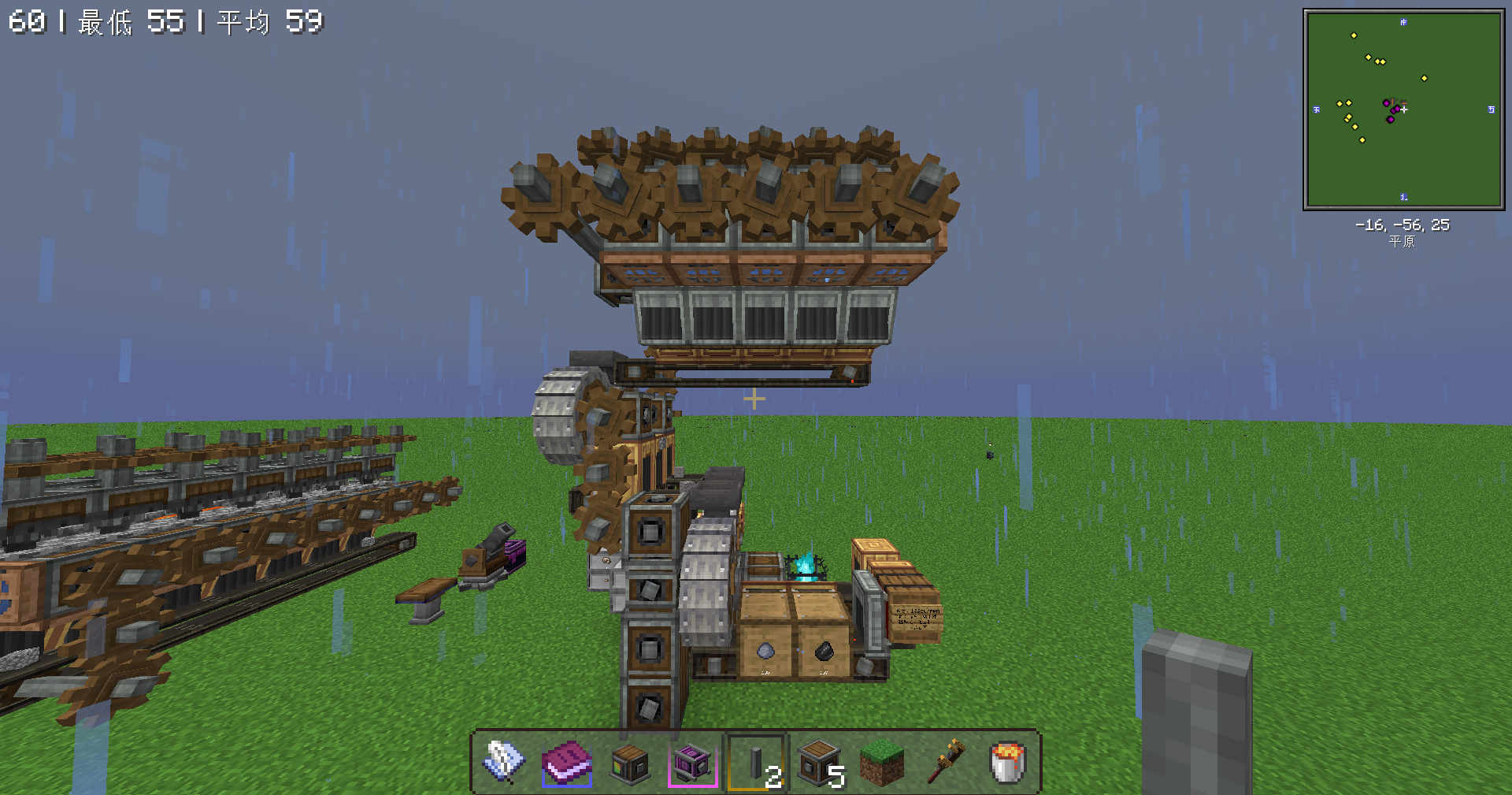 到目前为止,锅炉的部分就完成了。接下来就是造物机的部分,这部分有蓝图,主要是材料准备。圆石造物机材料用量真是相当大,还好有咲夜之前搭的树场和刷石机,还有烧纸和 Jason 昨天辛苦搜罗来的铁,不然木头、安山合金和铁全都不够花的。
