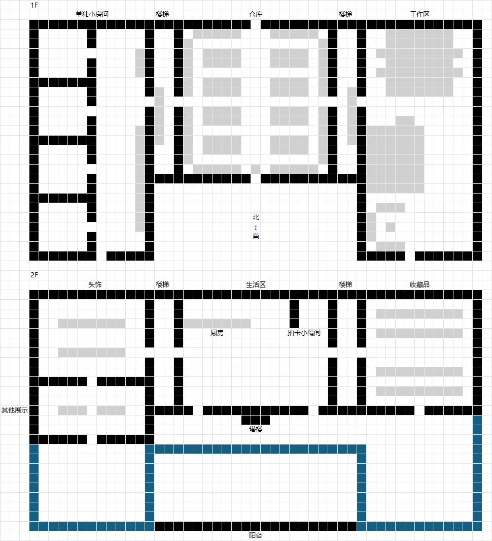 首先,一进门需要是一个大仓库,相当大的仓库。因为我们使用了很多抽屉,所以四面墙上还需要给抽屉留空间。普通箱子的话,直接背靠背往上摆最省空间,我在左右两侧对称留了几组放箱子的地方。这样,一个四四方方的大仓库就好了。